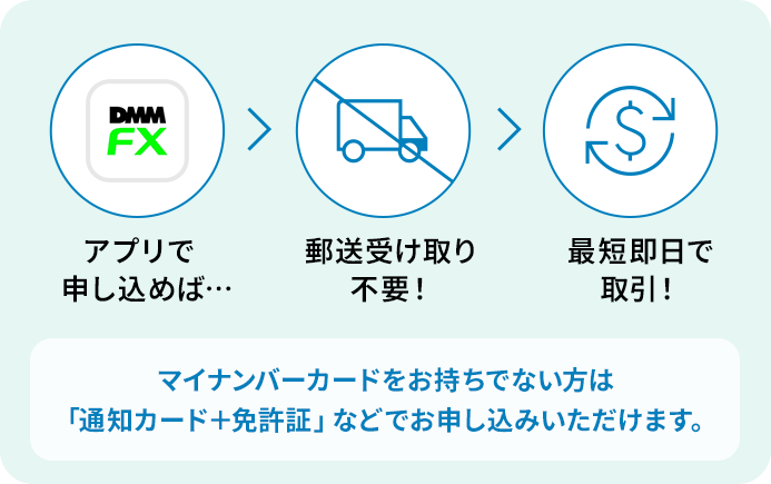 本ページにある「アカウント登録(無料)」ボタンより、「DMM FX」のアプリをダウンロードし、「アカウント登録」をタップし、手順に沿って必要事項ご記入の上、アカウント登録をお申込ください。