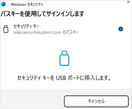 ▼「パスキーでログイン」をクリック後、「セキュリティ キーをUSB ポートに挿入します。」と表示されます。