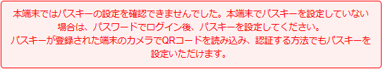 ▼「本端末ではパスキーの設定を確認できませんでした。本端末でパスキーを設定していない場合は、パスワードでログイン後、パスキーを設定してください。パスキーが登録された端末のカメラでQRコードを読み込み、認証する方法でもパスキーを設定いただけます。」と表示されます。